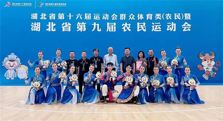 熱烈祝賀謝芳同志(照片中第一排從左到右第三位)在湖北省第十六屆運動會群眾類(農(nóng)民)健身操團體比賽中獲得一枚金牌,四枚銀牌,團體總分第一的優(yōu)異成績。