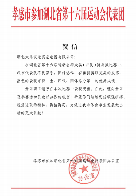 下圖為湖北省第十六屆運動會代表團辦公室發(fā)來的感謝信!